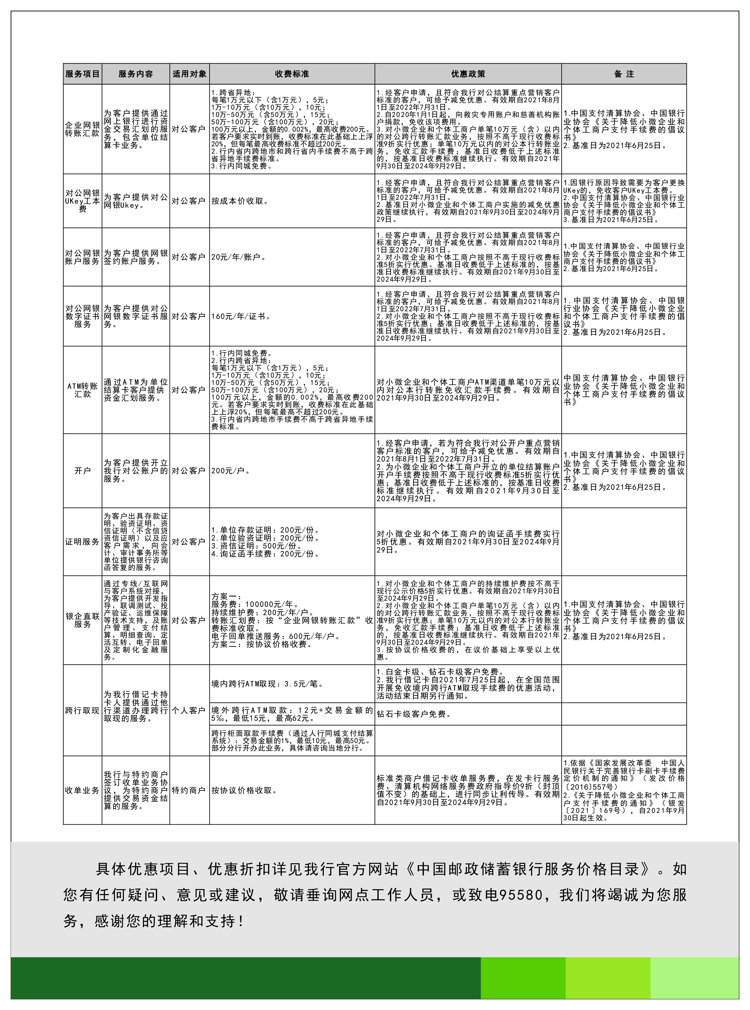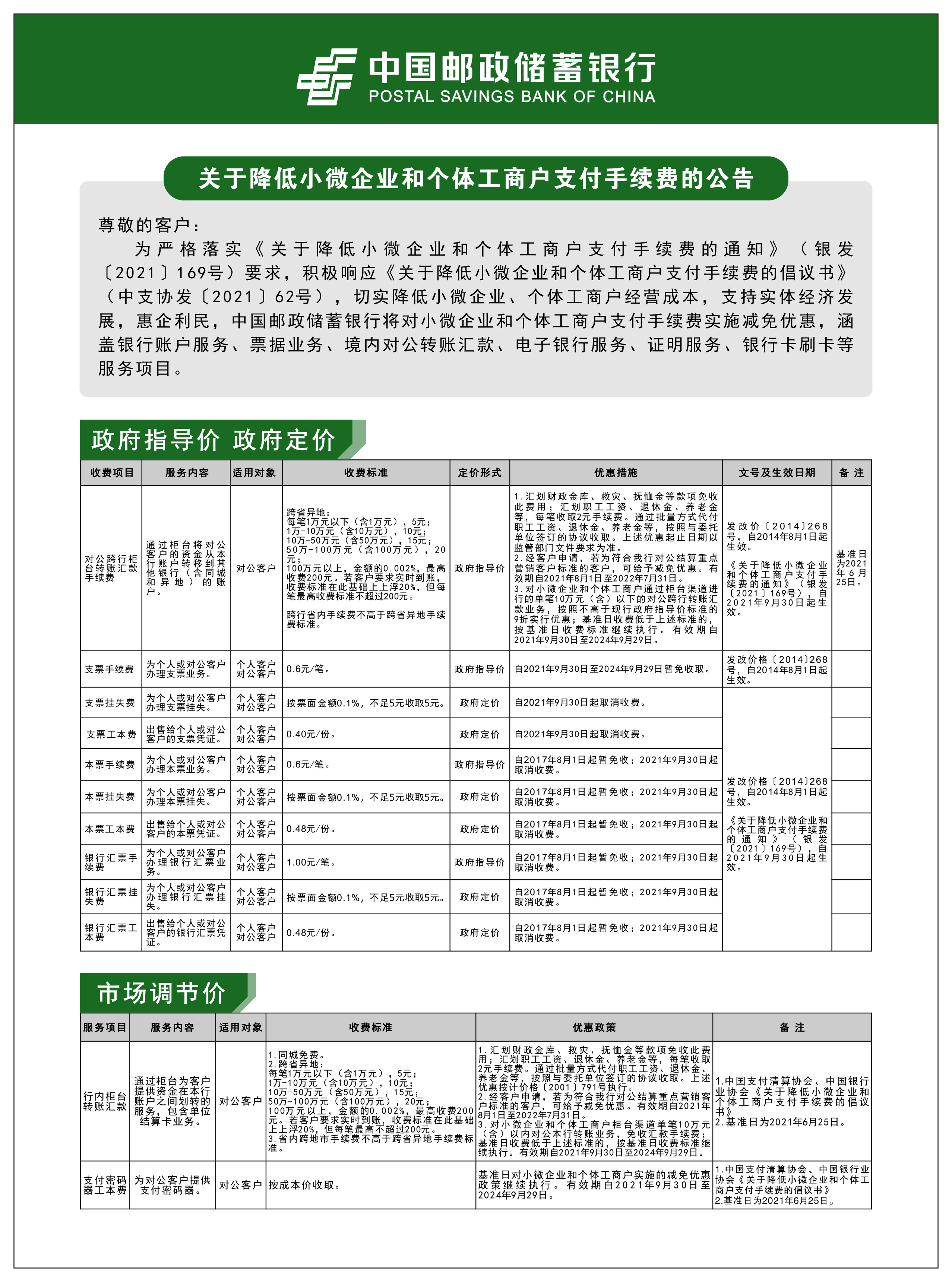 中國郵政儲蓄銀行關于降低小微企業和個體工商戶支付手續費的公告