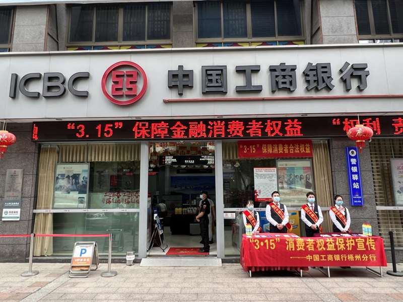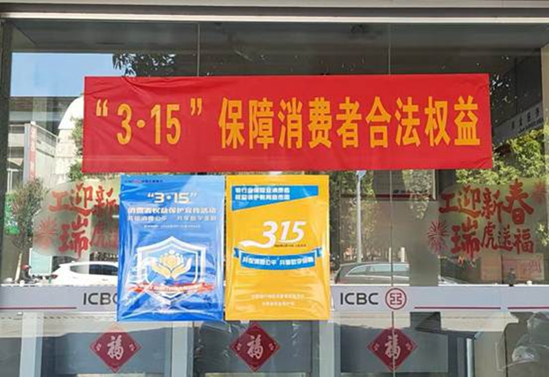 2022年3月15日,工商銀行梧州分行組織全轄各支行、網點積極開展“3·15”金融消費者權益保護教育宣傳周活動,圍繞“共促消費公平共享數字金融”這一年度主題,深入開展宣傳教育活動,不斷提升消費者金融素質和防范風險意識。 活動期間,該行充分發揮營業網點的宣傳主陣地作用,在網點LED宣傳屏滾動播放“3·15保障金融消費者權益”“共促消費公平共享數字金融”“權利責任風險”等系列主題宣傳口號,通過懸掛宣傳橫幅、粘貼宣傳海報、播放宣傳案例、擺放宣傳折頁等各種方式,大力營造宣傳氛圍。