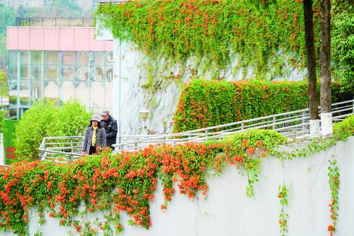 玫瑰湖公園東側入口,大片炮仗花開放,為公園綠化錦上添花。本報記者陳凡攝花名:炮仗花