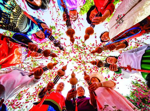 公園內,黃花風鈴木開得正盛,一些游人穿著民族服飾載歌載舞,其樂融融。