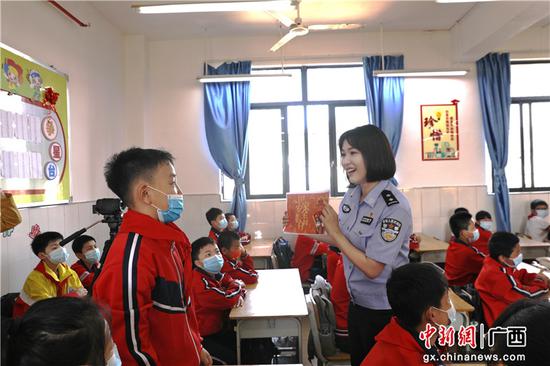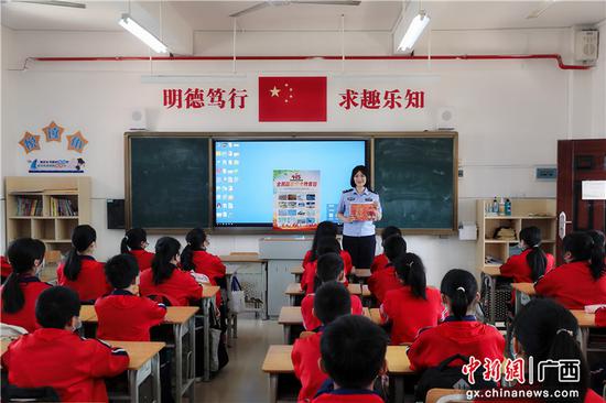 梧州邊檢站民警、梧州市第一實(shí)驗(yàn)學(xué)區(qū)校外輔導(dǎo)員梁蝶雙根據(jù)學(xué)生們的年齡特點(diǎn)和認(rèn)知水平,精心設(shè)計(jì)制作了色彩明亮、配圖豐富、通俗易懂的海報(bào)和課件。
