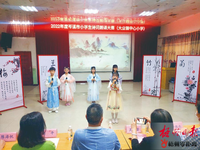 據(jù)了解,2022年梧州市小學(xué)生詩詞朗誦大賽由市委宣傳部、市文聯(lián)、梧州日報(bào)社、團(tuán)市委聯(lián)合主辦,梧州日報(bào)社小記者聯(lián)盟、梧州詩詞學(xué)會、市圖書館、梧州朗誦專業(yè)委員會承辦,廣西忠海置業(yè)發(fā)展有限公司協(xié)辦。對于此次比賽,岑溪市高度重視,結(jié)合創(chuàng)建詩詞曲示范市的要求,將其作為營造誦讀經(jīng)典良好氛圍、推動詩詞進(jìn)校園的重要內(nèi)容來抓。經(jīng)過廣泛宣傳發(fā)動,岑溪市共有23支小學(xué)隊(duì)伍報(bào)名參加岑溪分賽區(qū)比賽。岑溪市語委辦副主任吳毅芳介紹說,各參賽隊(duì)伍在選擇題材、挑選隊(duì)員、編排節(jié)目等方面都花了不少心思。為了展現(xiàn)更好的舞臺效果,一些隊(duì)伍還在服裝、背景等方面進(jìn)行了充分考慮。