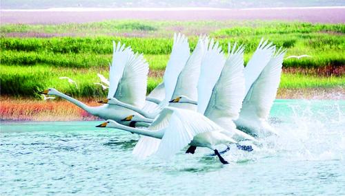 來年3月、4月,越冬候鳥們便相約集合,飛往遙遠的西伯利亞。北飛之前,它們展翅翱翔、鵝嘶雁叫,提前熱身演練。它們從水面起飛盤旋而上,氣勢蔚為壯觀,村民稱之為“盤云”,一時間萬鳥蔽空,鳴聲不絕于耳,直至4月過去方才消停。