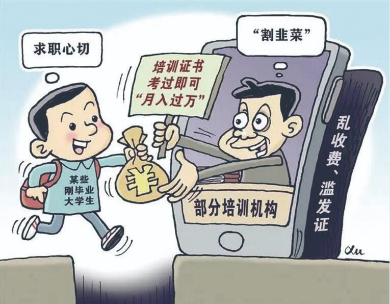 “碳排放管理高級證書,兼職掛靠月入過萬”“收納整理師不限學歷門檻,10天速成取證”“家庭教育指導師崗位缺口數百萬,拿下證書就有了金飯碗”……春招旺季,網絡上各類名目繁多的技能考證項目讓人眼花繚亂。新華社記者調查發現,部分線上培訓機構以新職業的職業資格、職業技能等級等名義隨意舉辦培訓、評價、發證活動,亂收費、濫發證,不少剛畢業或準畢業的大學生被割“韭菜”。隨著新職業涌現,相關培訓也日漸火熱,部分機構為招攬生源打起了擦邊球,滋生出眾多亂象。 (據《新華每日電訊》)