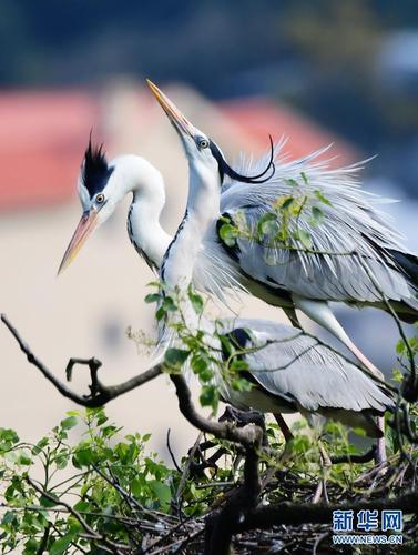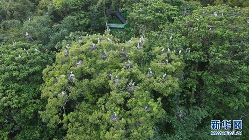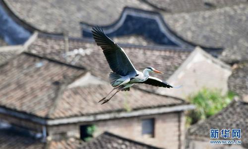 逾千只蒼鷺飛落在翠綠的樹叢上,宛若漂浮的片片雪花,與黛瓦屋頂?shù)男O村相映襯,透射出自然和諧的生態(tài)景觀。
