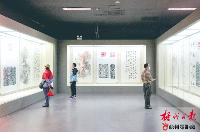 5月15日,市民來到市博物館三樓展廳欣賞鄭偉標書畫印作品展。為迎接5月18日第46個國際博物館日的到來,近期,市博物館舉辦《廣信追昔——鄭偉標書畫印作品展》。本次展覽以梧州歷史名勝為題材,展出一批描繪古蒼梧八景和歷史遺跡等內容的書、畫、印作品。梧州日報記者 陳凡 攝