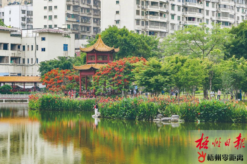 5月25日,眾多市民在潘塘湖中心涼亭游玩。近段時間,散落在潘塘公園湖岸各處的鳳凰花相繼開放,與湖邊盛開的美人蕉交相輝映,公園內紅花綠樹,碧水黃瓦,美不勝收,吸引眾多市民前來觀賞游玩。梧州日報記者 何鎏 攝