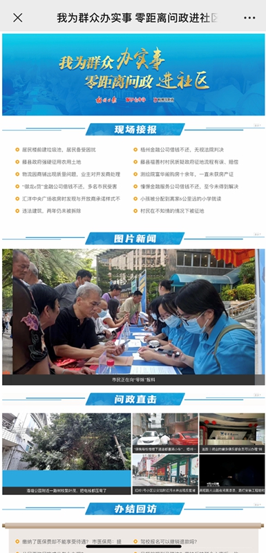2021年9月,梧州日報社與梧州市委網信辦聯合組織開展“我為群眾辦實事零距離問政進社區”活動,先后走進多個社區,現場收集群眾報料線索100多條,在紙媒和新媒體平臺聯合開展輿論監督,成功幫助群眾解決10多個民生問題。