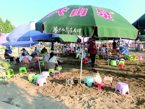 在泗州島,家長們帶著孩子在沙灘上玩耍。記者陳益銘攝
