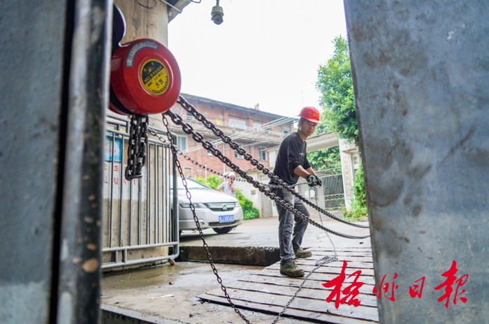 6月7日,工作人員正在關閉富民堤新民糧庫碼頭交通閘。自6月6日以來,市防洪排澇工程管理處根據汛情,陸續關閉城區各防洪堤的涵閘、交通閘,并開展泵站的抽排工作。 記者 陳凡 攝