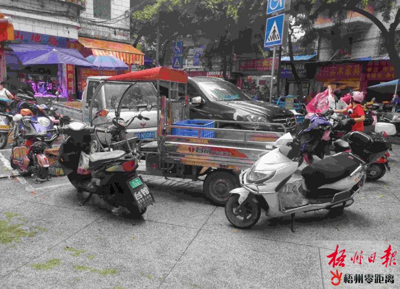 天天菜市門口的停車線外停滿了兩輪車及三輪車。梧州日報記者 紀榮蘭 攝