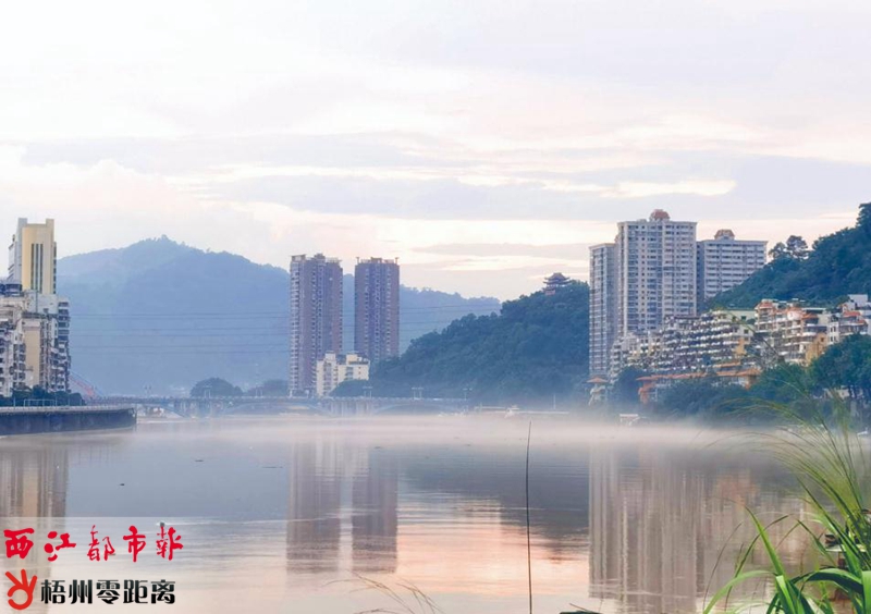 6月16日傍晚,梧州桂江江面縈繞著平流霧。那層薄薄的水霧,將岸上景物與水中倒影分隔。謝韻 攝