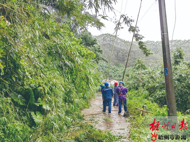受臺風(fēng)“暹芭”影響,岑溪市馬路鎮(zhèn)楊葉村10千伏路林線發(fā)生故障,岑溪供電公司馬路供電所黨員突擊隊開展搶修復(fù)電工作。 (岑溪供電公司供圖)
