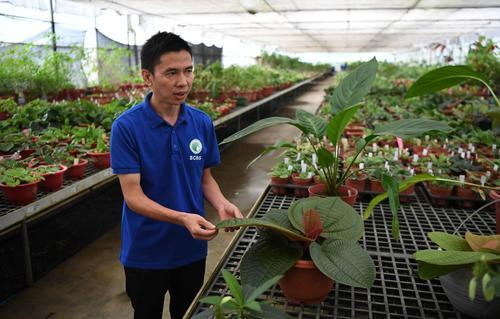 在華南國家植物園,工作人員介紹國家重點保護野生植物虎顏花(7月4日攝)。新華社記者鄧華攝
