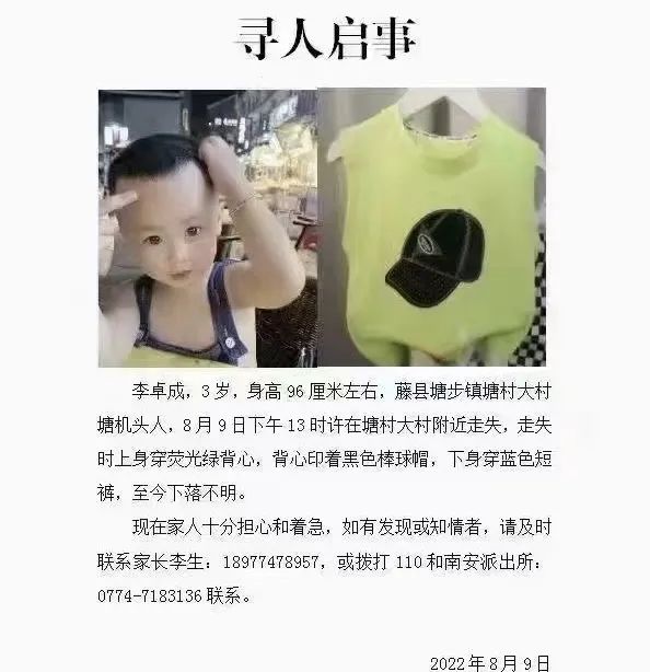 8月9日13時40分左右,塘步鎮(zhèn)塘村一名3歲小男孩在塘村大村片走失。接報后,塘步鎮(zhèn)政府、藤縣公安局南安派出所組織發(fā)動群眾開展搜尋工作,目前仍在全力搜尋中。請廣大群眾不造謠、不信謠、不傳謠,發(fā)現(xiàn)相關(guān)線索請與塘步鎮(zhèn)人民政府聯(lián)系,聯(lián)系電話:0774-7183123。