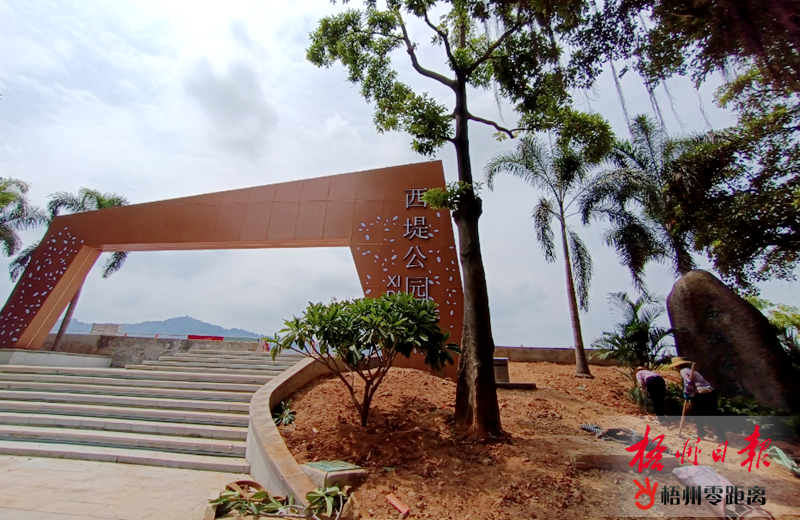 近段時間,施工單位逐步完善西堤公園多處入口及門廊,裝飾大門外觀,并在周邊種植多種花草樹木,進一步綠化美化公園。梧州日報記者 李鴻榮 攝