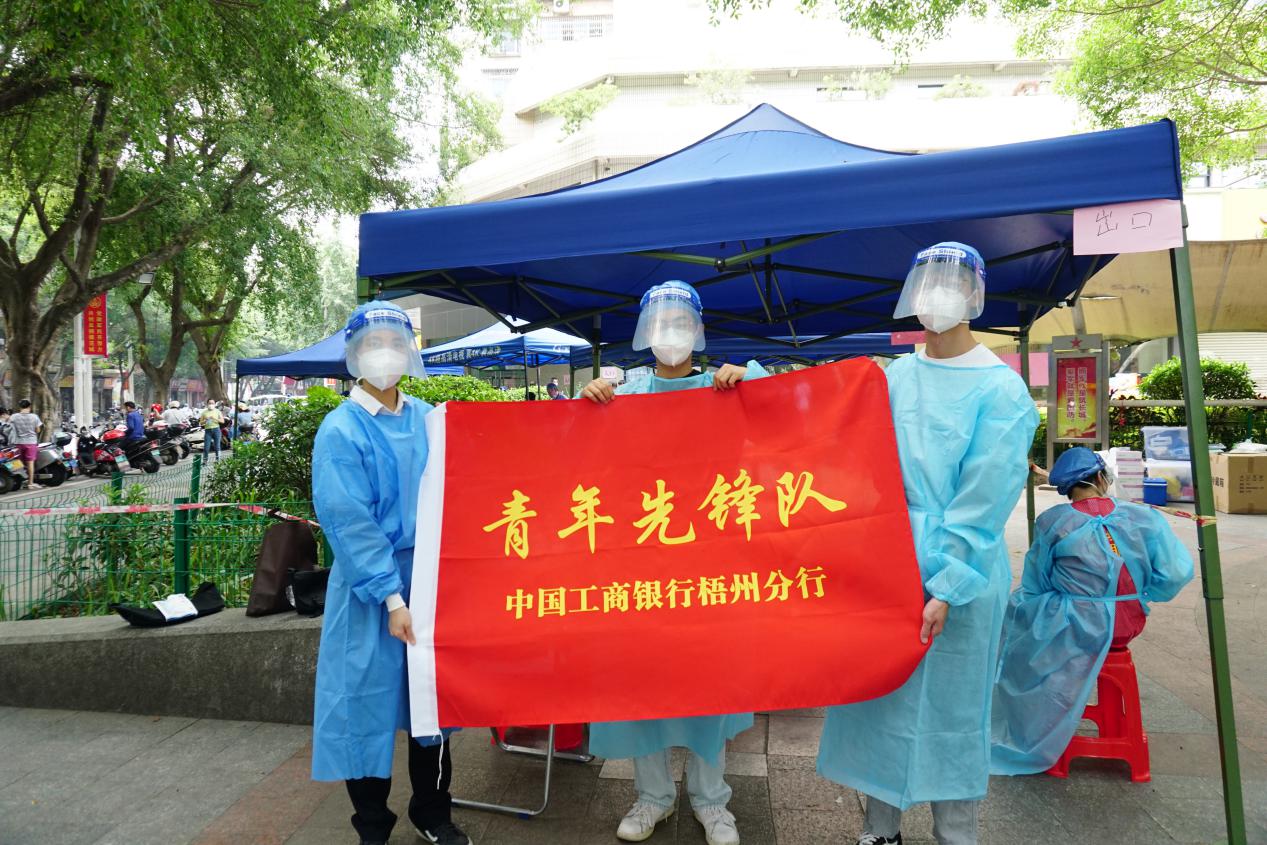 工商銀行梧州分行青年志愿者參加社區(qū)防疫工作。