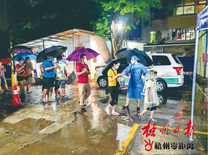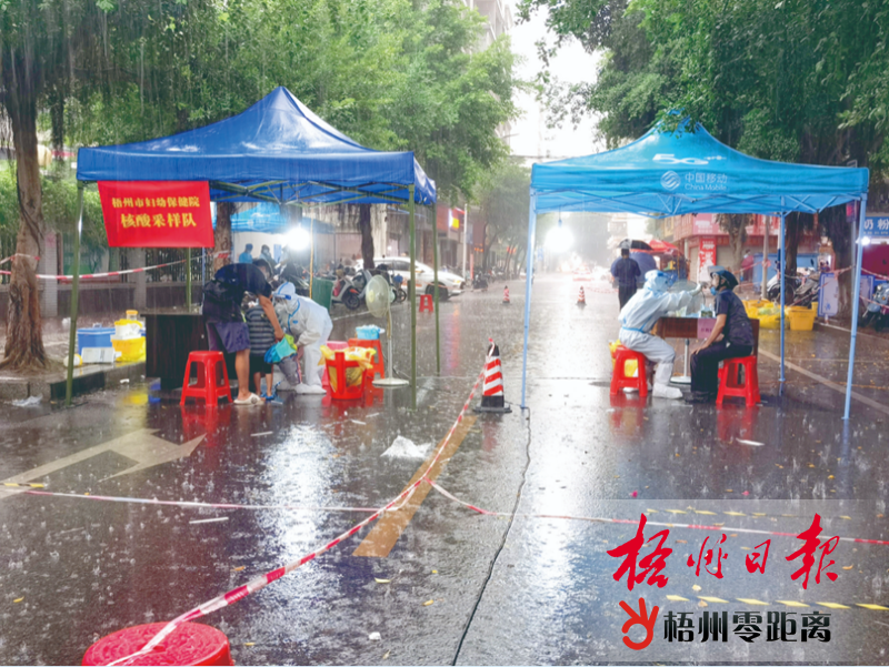 9月7日下午,梧州驟降滂沱大雨,市婦幼保健院醫護人員堅守在銀豐花園附近的核酸檢測采樣點,為市民進行核酸采樣。 (市婦幼保健院供圖)