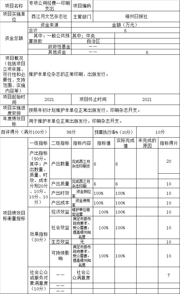項目績效自評綜述:根據年初設定的績效目標,專項公用經費-印刷支出項目自評得分為98分。發現的主要問題及原因:無。下一步改進措施:無。