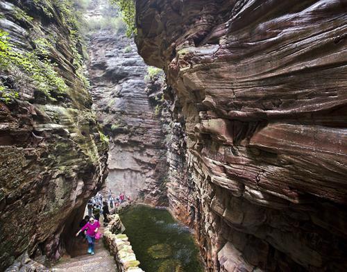 游客徒步來到黃崖洞景區(qū)內(nèi)的龍門夾峽谷。(資料圖)