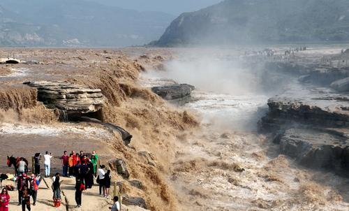 9月15日,游人在黃河壺口瀑布游覽(無人機照片)。近日,秦晉交界的黃河壺口瀑布水量大增,形成綿延數百米的壯美瀑布群。新華社記者陶明攝