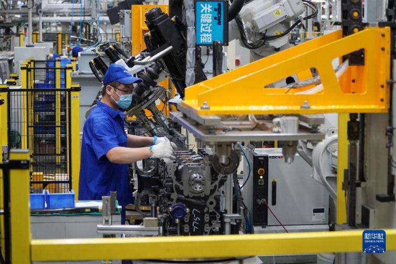 在山東省濰坊市,濰柴集團的工作人員在發動機生產線上工作(9月19日攝)。新華社記者 徐速繪 攝