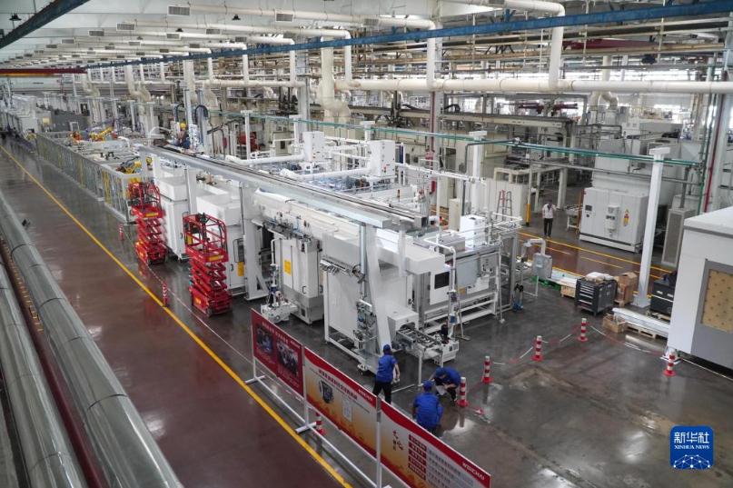 在山東省濰坊市,濰柴集團的工作人員在一條新的生產線上安裝調試設備(9月19日攝)。新華社記者 徐速繪 攝