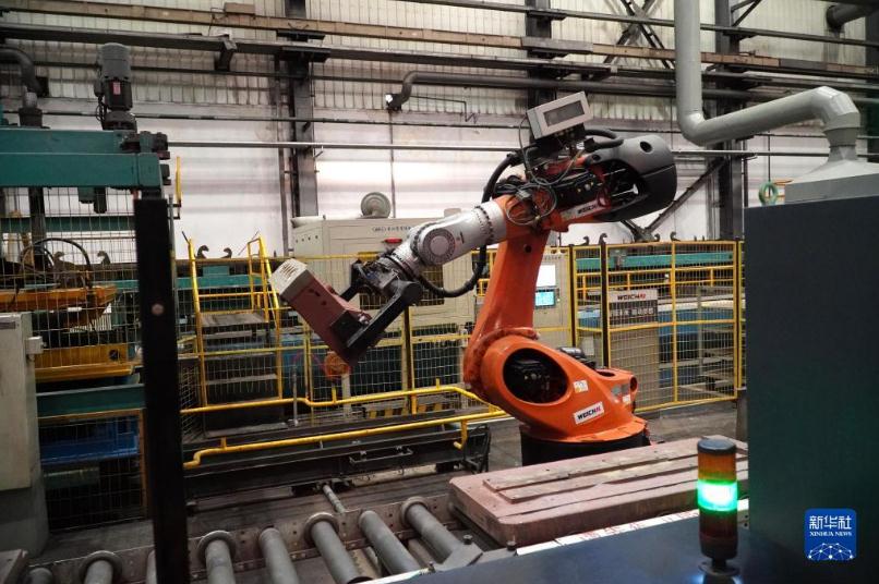 在位于山東省濰坊市的濰柴(濰坊)材料成型制造中心的生產車間,一臺機械手在工作(9月19日攝)。新華社記者 徐速繪 攝