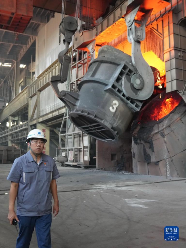 邯寶煉鋼廠特檔技術主管、轉爐車間副主任唐笑宇從轉爐附近經過(2022年9月7日攝)。新華社記者 楊世堯 攝