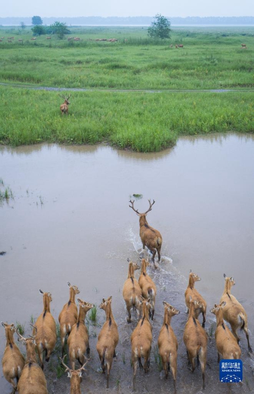 一群麋鹿在石首麋鹿國家級自然保護區內活動(2021年5月17日攝,無人機照片)。新華社記者 肖藝九 攝