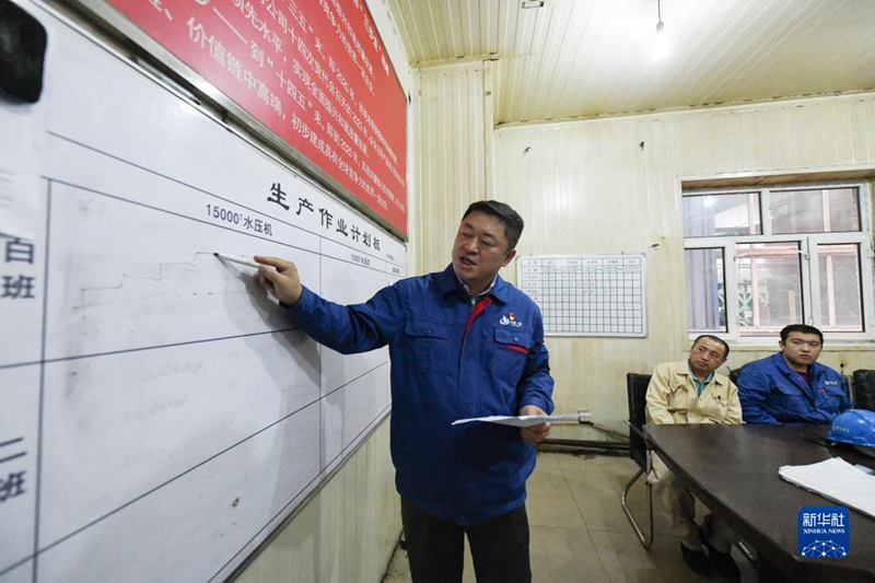 劉伯鳴在廠房會議室內為工友講解生產任務(2022年9月17日攝)。新華社記者 王松 攝