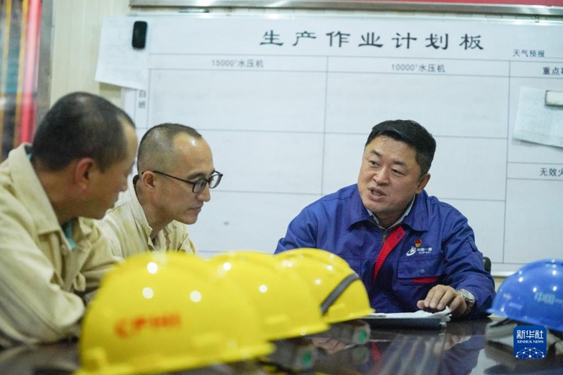 劉伯鳴(右一)在廠房會議室內與工友討論生產作業事項(2022年9月17日攝)。新華社記者 王松 攝