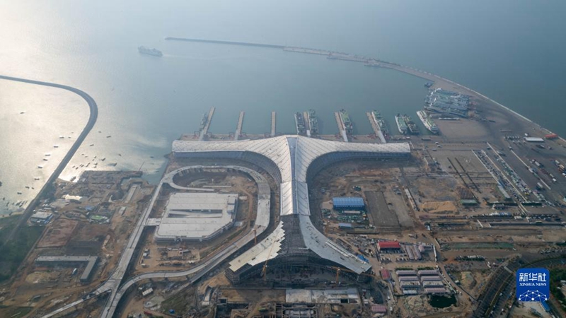9月26日拍攝的海口新海滾裝碼頭客運綜合樞紐站工程項目施工現場(無人機照片)。新華社記者 胡智軒 攝