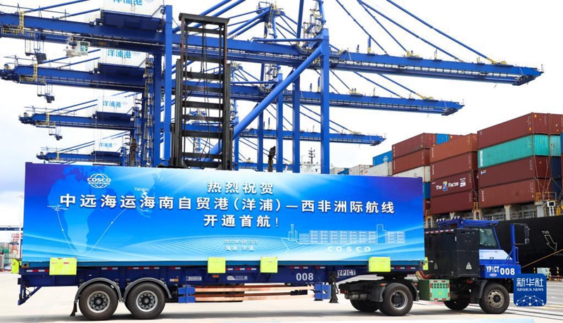 9月23日這一天,海南自貿港(洋浦)—西非洲際航線首航儀式在這里舉行。隨著一聲汽笛長鳴,滿載集裝箱的輪船緩緩駛離碼頭,標志著海南首條通達非洲的集裝箱航線正式開通。