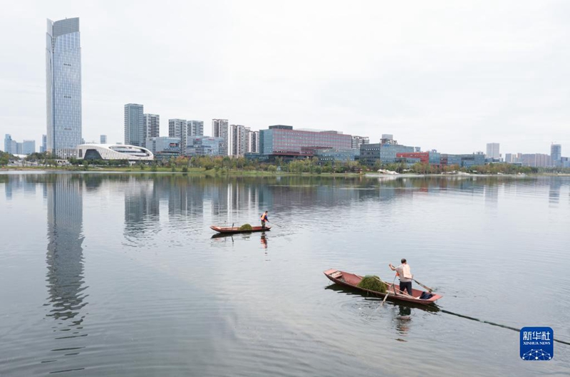 金秋時節,四川天府新區興隆湖,4500余畝水面波光粼粼,湖水清澈見底,幾根水草隨波漂蕩。管護員賴小利站在小船上,熟練地伸出長桿網兜一撈一翻一抖,水草便被甩上船。
