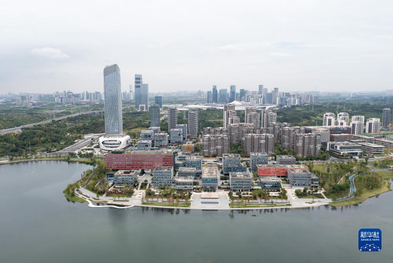俯瞰四川天府新區興隆湖畔的科研機構建筑大樓群(2022年9月21日攝,無人機照片)。新華社記者 江宏景 攝
