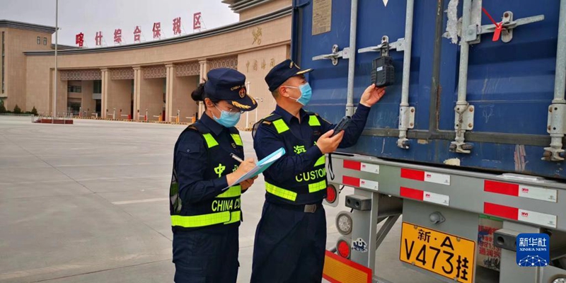 海關現場關員在喀什綜合保稅區登記入區車輛電子鎖信息(2022年9月14日攝)。新華社發(圖爾罕·麥麥提伊敏 攝)