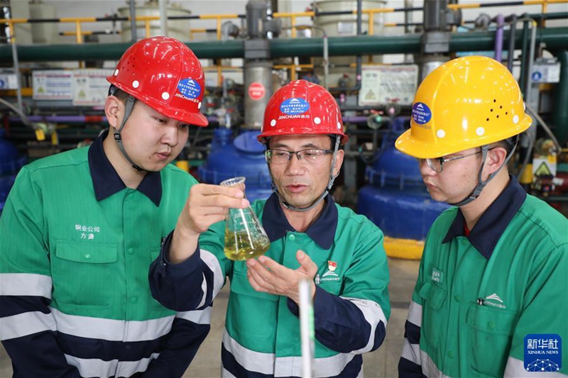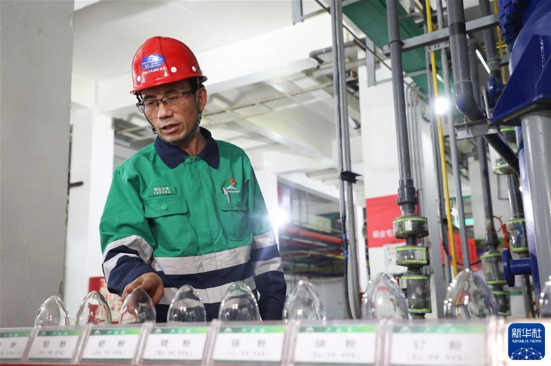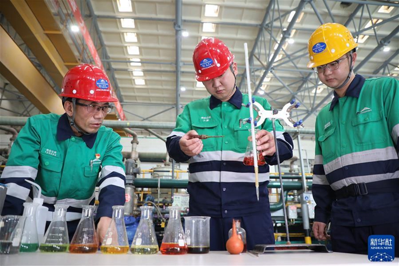 在甘肅省金昌市金川區(qū),金川集團(tuán)銅業(yè)有限公司貴金屬冶煉分廠提純工序工序長(zhǎng)潘從明(中)在生產(chǎn)現(xiàn)場(chǎng)指導(dǎo)職工進(jìn)行實(shí)驗(yàn)(2022年9月21日攝)。新華社記者 馬希平 攝