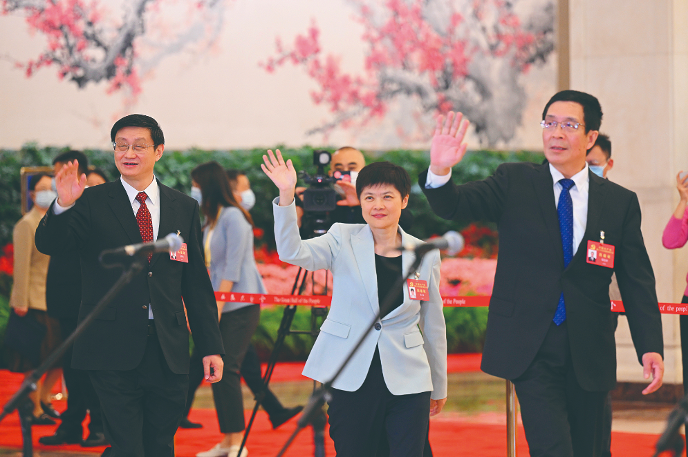 這是閉幕會后,吳燕生、朱敏、張連鋼代表(自左至右)步入“代表通道”,準(zhǔn)備接受采訪。新華社記者 金良快 攝