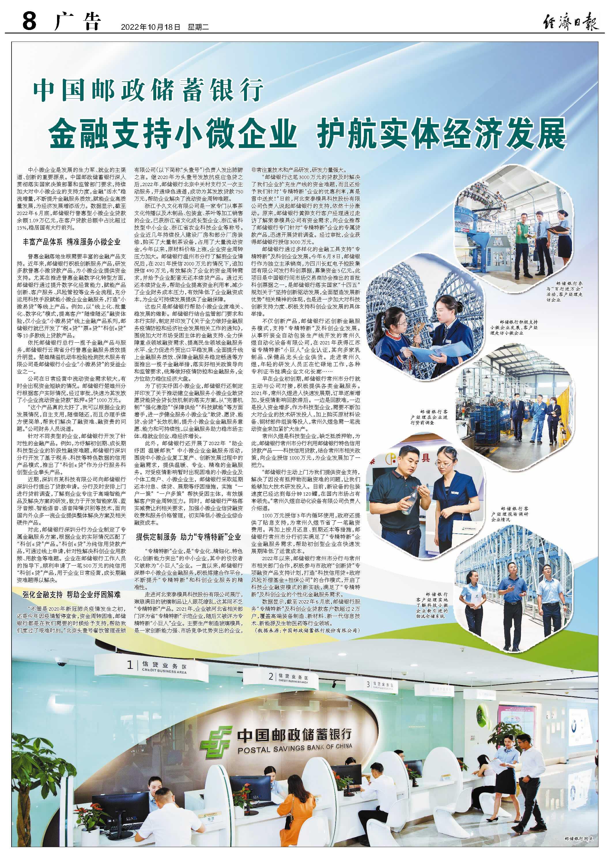 中小微企業是發展的生力軍、就業的主渠道、創新的重要源泉。中國郵政儲蓄銀行深入貫徹落實國家決策部署和監管部門要求,持續加大對中小微企業的支持力度,金融“活水”穩流增量,不斷提升金融服務質效,賦能企業高質量發展,為經濟發展增添活力。數據顯示,截至2022年6月底,郵儲銀行普惠型小微企業貸款余額1.09萬億元,在客戶貸款總額中占比超過15%,穩居國有大行前列。 豐富產品體系精準服務小微企業 普惠金融落地生根需要豐富的金融產品支持。近年來,郵儲銀行積極創新服務產品,研發多款普惠小微貸款產品,為小微企業提供資金支持。尤其在推進普惠金融數字化轉型方面,郵儲銀行通過提升數字化經營能力,賦能產品創新、客戶服務、風險管控等業務全流程,充分運用科技手段賦能小微企業金融服務,打造“小微易貸”等線上產品。例如,以“線上化、批量化、數字化”模式,提高客戶“隨借隨還”融資體驗,僅小企業“小微易貸”線上金融產品系列,郵儲銀行就已開發了“稅e貸”“票e貸”“科創e貸”等10多款線上貸款產品。 依托郵儲銀行總行一攬子金融產品與服務,郵儲銀行云南省分行普惠金融服務質效提升明顯。楚雄精溢機動車檢驗檢測技術服務有限公司是郵儲銀行小企業“小微易貸”的受益企業之一。 公司在日常經營中流動資金需求較大,有時會出現資金短缺的情況。郵儲銀行楚雄州分行根據客戶實際情況,經過審批,快速為其發放了小企業流動資金貸款“抵押e貸”1000萬元。 “這個產品真的太好了,我可以根據企業的發展情況,自主支用,隨借隨還,而且辦理手續方便簡單,幫我們解決了融資難、融資貴的問題。”公司財務人員說道。 針對不同類型的企業,郵儲銀行開發了針對性的金融產品。例如,為紓解初創期、成長期科技型企業的階段性融資難題,郵儲銀行深圳分行開發了基于稅務、科技等特色數據的信用產品模式,推出了“科創e貸”作為分行服務科創型企業拳頭產品。 近期,深圳市某科技有限公司向郵儲銀行深圳分行提出了貸款申請。分行及時安排上門進行貸前調查,了解到企業專注于高端智能產品及解決方案的研發,致力于開發智能家居、藍牙音頻、智能語音、語音降噪識別等技術,面向國內外眾多一流企業提供整體解決方案及相關硬件產品。 對此,郵儲銀行深圳分行為企業制定了專屬金融服務方案,根據企業的實際情況匹配了“科創e貸”產品。“科創e貸”為純信用貸款產品,可通過線上申請,針對性解決科創企業用款頻、用款急等難題。企業在郵儲銀行工作人員的指導下,順利申請了一筆500萬元的純信用“科創e貸”產品,用于企業日常經營,成長期融資難題得以解決。 強化金融支持幫助企業紓困解難 “不管是2020年新冠肺炎疫情發生之初,還是今年因疫情暫停堂食,資金周轉困難,郵儲銀行都是在我們需要的時候給予支持,幫助我們度過了艱難時刻。”北京頭壹號餐飲管理連鎖有限公司(以下簡稱“頭壹號”)負責人發出肺腑之言。繼2020年為頭壹號發放抗疫應急貸之后,2022年,郵儲銀行北京中關村支行又一次主動服務,開通綠色通道,成功為其發放貸款750萬元,幫助企業解決了流動資金周轉難題。 浙江子久文化有限公司是一家專門從事茶文化傳播以及木制品、包裝盒、茶葉等加工銷售的企業,已獲浙江省文化成長型企業、浙江省科技型中小企業、浙江省農業科技企業等稱號。企業近幾年持續投入建設廠房和部分廠房裝修,購買了大量制茶設備,占用了大量流動資金,今年以來,原材料價格上漲,企業資金周轉壓力加大。郵儲銀行溫州市分行了解到企業情況后,在2021年授信2000萬元的情況下,追加授信490萬元,有效解決了企業的資金周轉需求,并給予企業配套無還本續貸產品。通過無還本續貸業務,幫助企業提高資金利用率,減少了企業財務成本壓力,有效降低了企業融資成本,為企業可持續發展提供了金融保障。 這些只是郵儲銀行幫助小微企業渡難關、穩發展的縮影。郵儲銀行結合監管部門要求和本行實際,制定并印發了《關于全力做好金融服務疫情防控和經濟社會發展相關工作的通知》,圍繞加大對市場受困主體的金融支持、全力保障重點領域融資需求、提高民生領域金融服務水平、全力促進外貿出口平穩發展、全面提升線上金融服務質效、保障金融服務穩定暢通等方面推出一攬子金融舉措,落實好相關政策導向和監管要求,統籌做好疫情防控和金融服務,全方位助力穩住經濟大盤。 為了切實紓困小微企業,郵儲銀行還制定并印發了關于推動建立金融服務小微企業敢貸愿貸能貸會貸長效機制的落實方案,從“完善機制”“強化激勵”“保障供給”“科技賦能”等方面著手,進一步健全服務小微企業“敢貸、愿貸、能貸、會貸”長效機制,提升小微企業金融服務意愿、能力和可持續性,以金融服務助力穩市場主體、穩就業創業、穩經濟增長。 此外,郵儲銀行還開展了2022年“助企紓困溫暖郵我”中小微企業金融服務活動,圍繞中小微企業復工復產、創新發展過程中的金融需求,提供溫暖、專業、精準的金融服務。對受疫情影響暫時出現困難的小微企業及個體工商戶、小微企業主,郵儲銀行采取延期還本付息、續貸、展期等紓困措施,實施“一戶一策”“一戶多策”幫扶受困主體,有效緩解客戶資金周轉壓力。同時,郵儲銀行嚴格