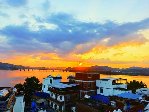 很快,我們可以看到太陽從西江的上游緩緩降落,像一顆發(fā)光的黃金雞蛋,從棉花糖一樣的云間穿過,跌入青山的懷抱,而后蛋殼破碎,橘紅色的蛋黃濺出,并以慢倍速潑灑,令周圍的天空裹上一層唯美的色彩。