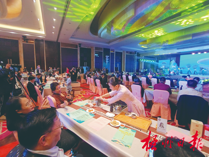 第十九屆梧州寶石節將寶石的現代時尚與六堡茶的深厚底蘊進行融合展示,嘉賓在活動中品飲六堡茶。記者 李鴻榮 攝