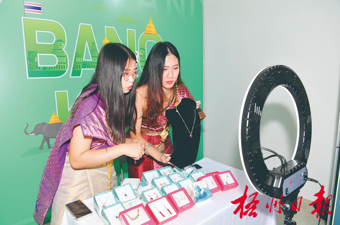 11月25日,第十九屆梧州珠寶展設(shè)置的小語種直播間內(nèi),主播們正在進(jìn)行珠寶直播帶貨。 記者 李鴻榮 攝
