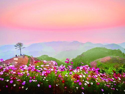 通天頂海拔上千米,是歸義鎮第一高峰,跨越歸義鎮勒水村和梨木鎮大旺村,通天頂2000畝生態茶園建設如火如荼,種植有很多格桑花,而今花開正艷。觀日出者晚上可以在山上露營,感受天然氧吧魅力,翌日觀日出和賞花,一舉數得,怡情于山水和日出之間。