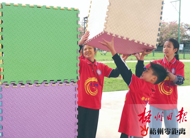 與此同時,“搭建通天塔”項目也在如火如荼地開展。現場,教官考起學生們的數學,“六個正方形可以組成什么?”學生們異口同聲地回答說:“正方體。”教官繼續追問:“那么,如果你們手上有36個正方形,可以拼成幾個正方體呢?”學生們快速搶答道:“可以拼成6個正方體。”教官贊揚道:“大家的數學都學得很不錯,我們開始挑戰吧。”隨后,教官讓每個代表隊拿36塊地墊,并詳細講解游戲規則:“這個項目叫‘搭建通天塔’,我們要在規定時間內搭建六層‘通天塔’。‘通天塔’矗立在地面,經受10秒不倒,即為挑戰成功。”