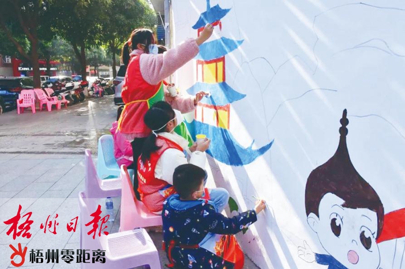 梧州零距離網-梧州日報訊 1月7日上午,長洲區大塘街道以“黨建共建互促互學”為主題,聯合鐵塔公司梧州市長洲區辦事處、華洋社區等單位人員,組織中小學生家庭約30人在長洲區金湖北路開展公益廣告墻繪活動。