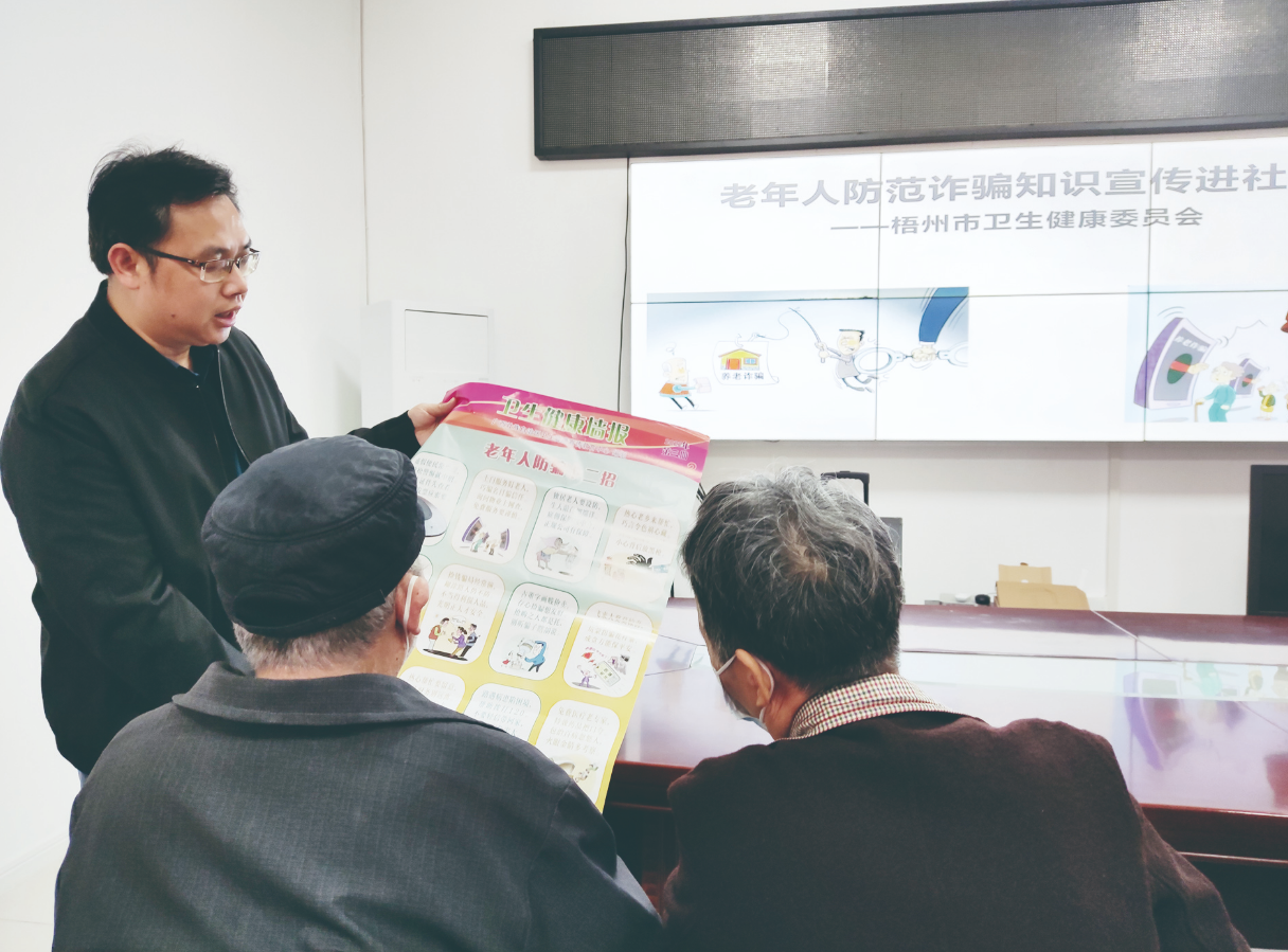 2022年以來,市衛生健康委共開展了老年人防范詐騙知識宣傳活動12場,發放老年人防詐騙、老年健康科普宣傳手冊等宣傳資料2800多份,電子顯示屏滾動播放防范養老詐騙宣傳標語3500多條。此外,市衛生健康委還結合2023年元旦春節文明實踐志愿服務活動,開展老年人防范詐騙知識進鄉村宣傳;充分運用健康梧州微信公眾號、電子滾動屏等媒體手段發布涉老詐騙的提示、預警信息,推送養老詐騙公益廣告,使涉老反詐宣傳深入人心。