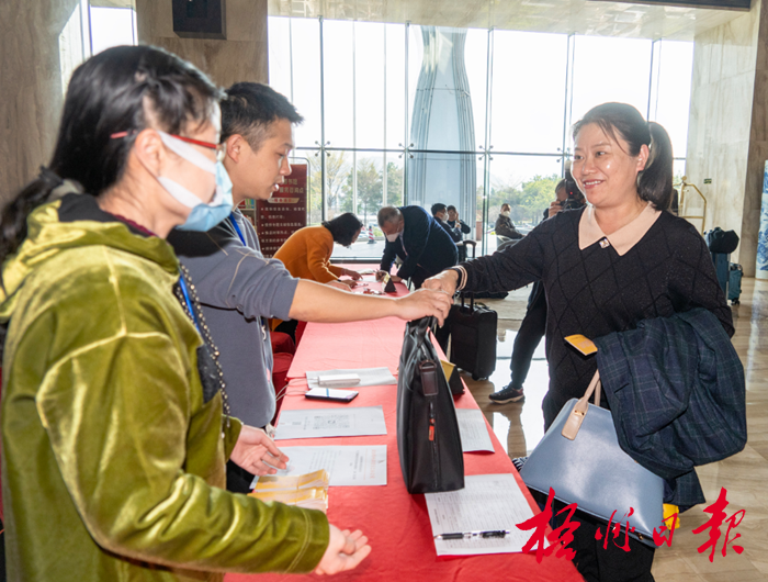 2月20日,政協(xié)委員陸續(xù)來到國龍大酒店大堂簽到登記和領(lǐng)取材料。 記者 陳凡 攝