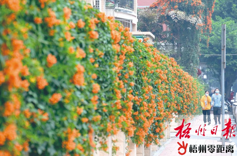3月5日,銀湖北路的炮仗花開正艷。近日來,銀湖北路的炮仗花開滿墻上,橙花綠葉的景觀吸引了不少路過的市民的眼光。梧州日報記者 楊揚 攝