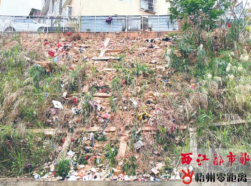 3月14日,豐業新苑小區邊坡上布滿生活垃圾。西江都市報記者 羅卡妮 實習生 陳秋然 攝